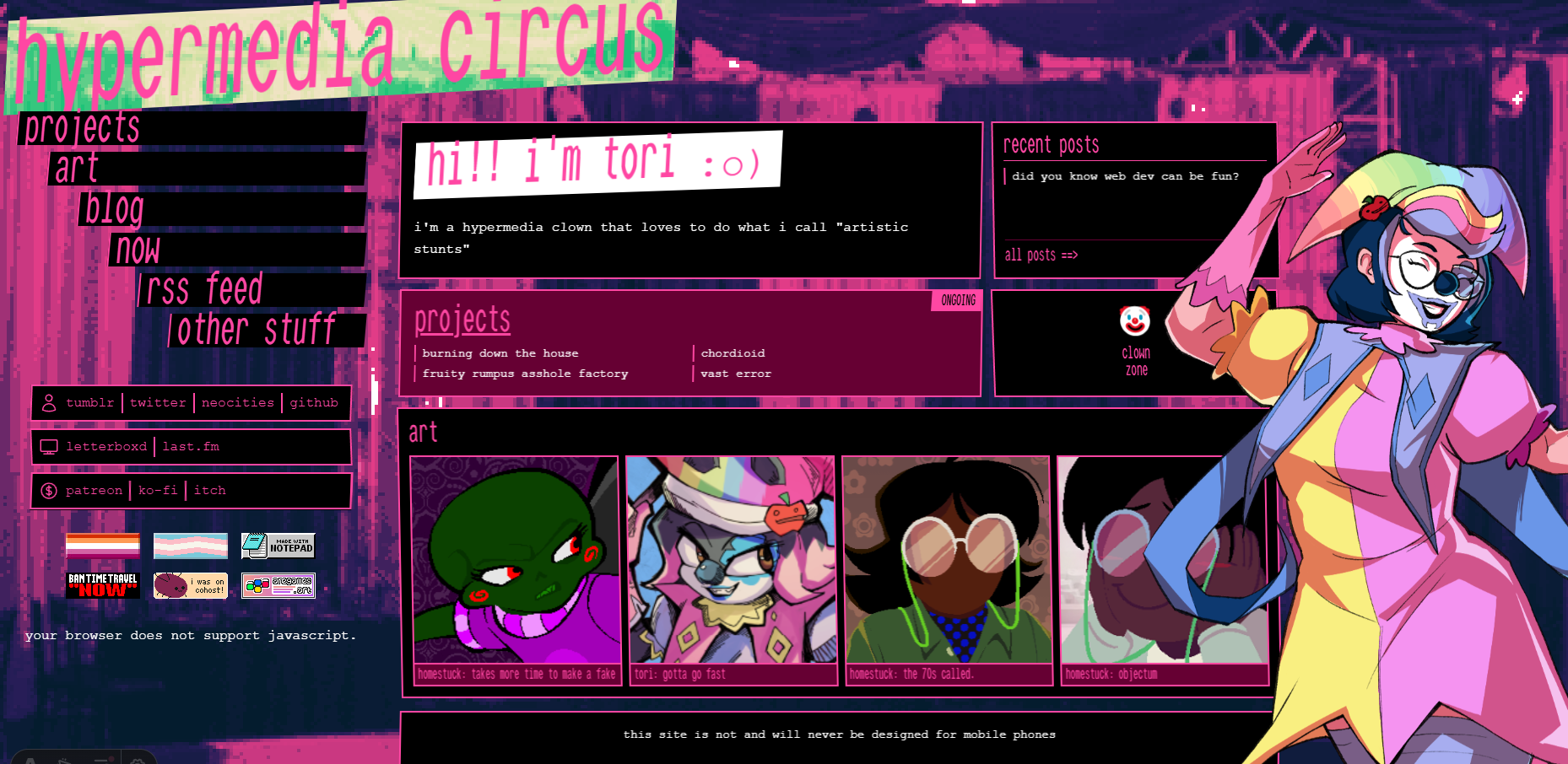 but here i am, in 2026. and i'm updating my neocities. this page is nearly a decade old. there's a lot of writing i don't necessarily stand by, there's a lot of stuff that has aged better than i expected. all the old blog posts can be found in the archive. this includes a lot of writing on homestuck, and a lot of postmortems for indie projects that never went anywhere, because any game that gets made is its own miracle.