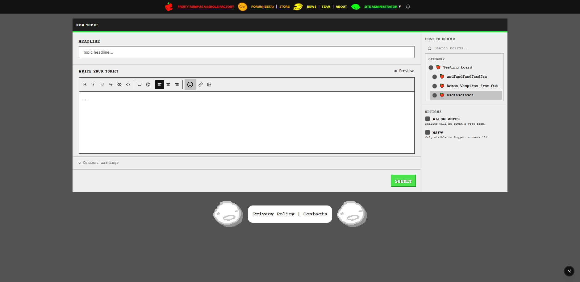 this last year i've been getting really into web development. i had the responsibility of coding the website for the fruity rumpus asshole factory, a licensing label for homestuck fan works that allows them to make money off of merchandise and legally use the homestuck brand for fan work, as well as a forum. the forum is just okay, but here's a delicious preview for the next update. it, too, is getting a visual overhaul.